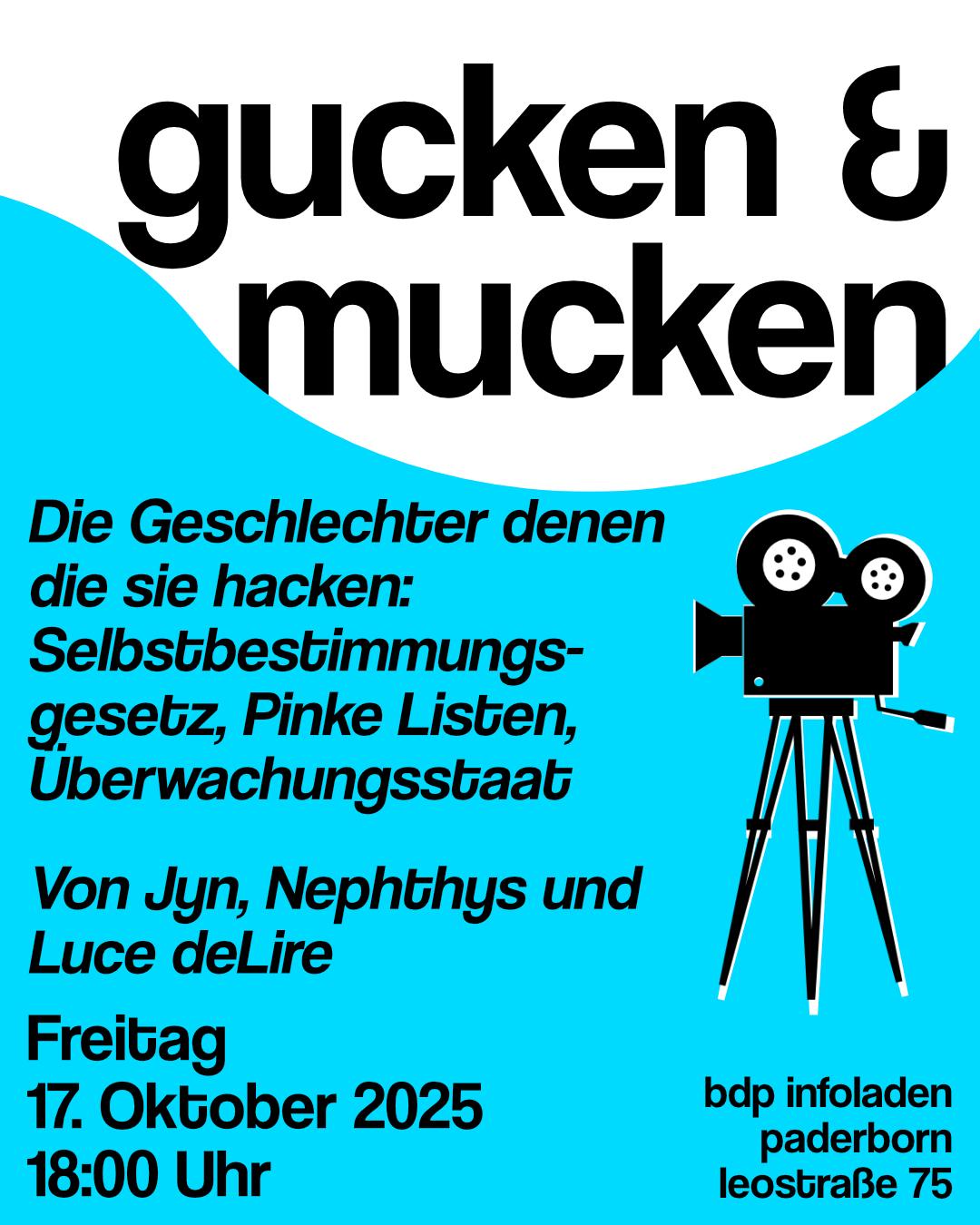 Bei Gucken & Mucken werden wir gemeinsam einen Film oder Vortrag schauen und bei Bedarf danach diskutieren.